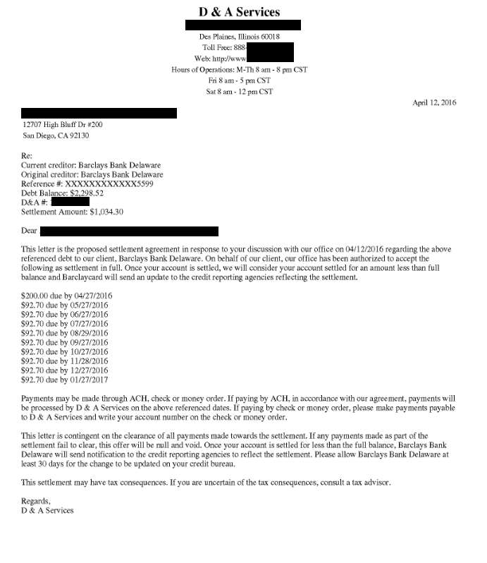 Settlement Letters From Barclay S Bank Consumer Debt Help Association
